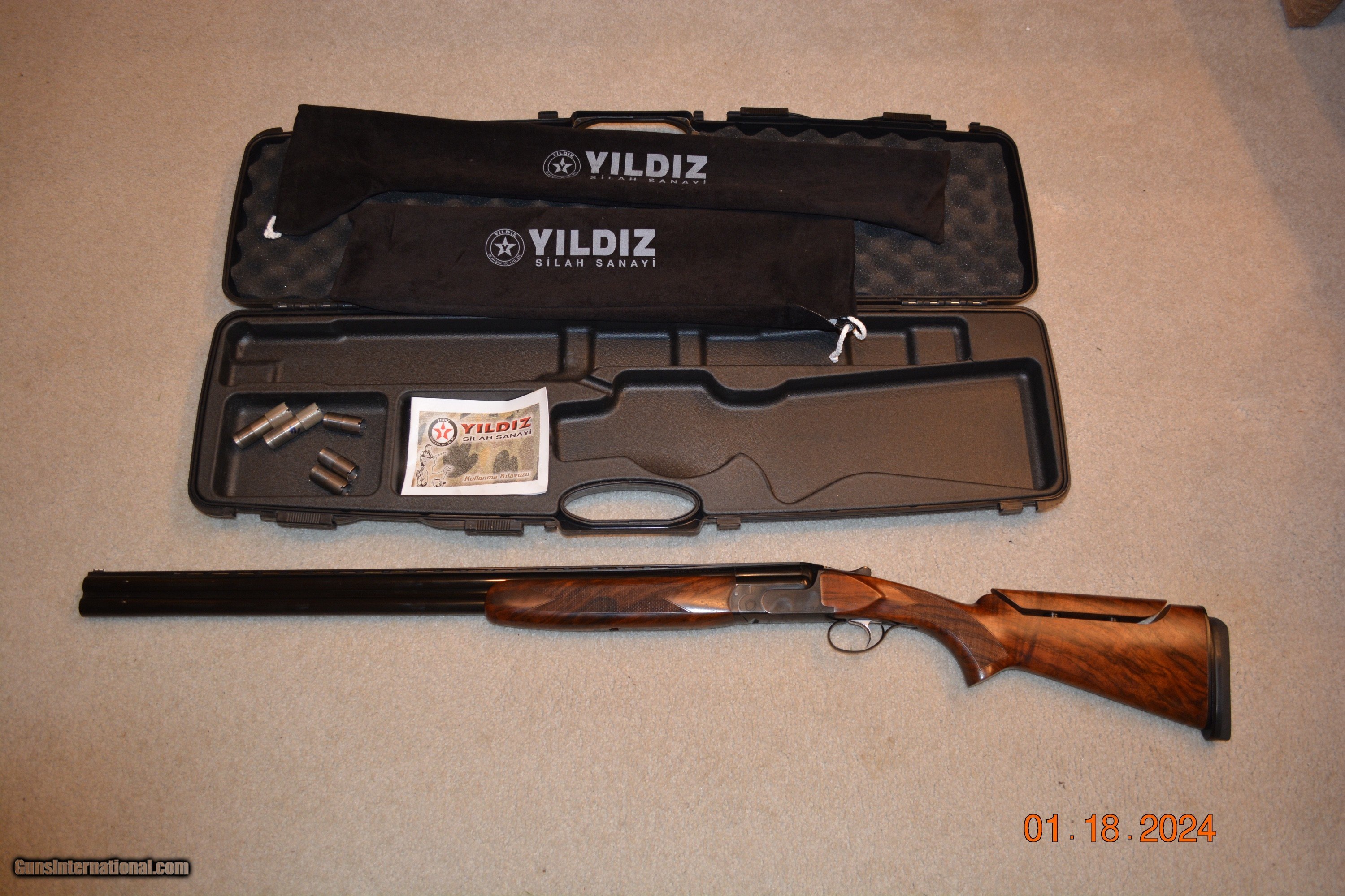 Description: Yildiz Pro Sporter 12 Ga. O/U Serial # 165266. 30" Barrels. Adj. Comb, Adj Butt Plate. Comes with Factory Case, 2 Factory Extended Chokes one is Full, other 1/4 or 3 notches Modified. There are Five Flush chokes # 1 thru # 5. Also includes a Set of Briley SideKicks 2.0 in 20 Gauge with knockouts, setting tool, and hammer. Stock has a few handling marks, Metal is in good condition. SOLD Manufacturer: Yildiz Model: Pro Sporter Serial Number: 165266 Barrel Length: 30 Ejectors: Yes Condition: Very Good Metal Condition: Excellent Wood Condition: A few handling marks Bore Condition: Excelent Triggers: One Stock Drop: 2 Stock Comb: Adjustable Stock Heel: Adjustable 2.5" as shown Butt Pad: Kick Ezz LOP: 14.5 Weight: 8.50 lbs |