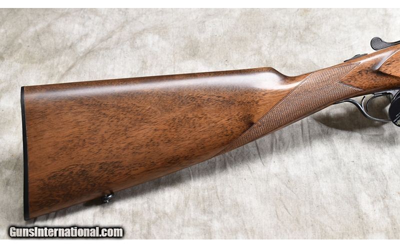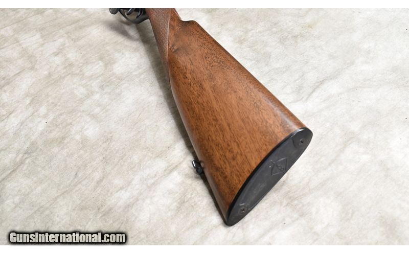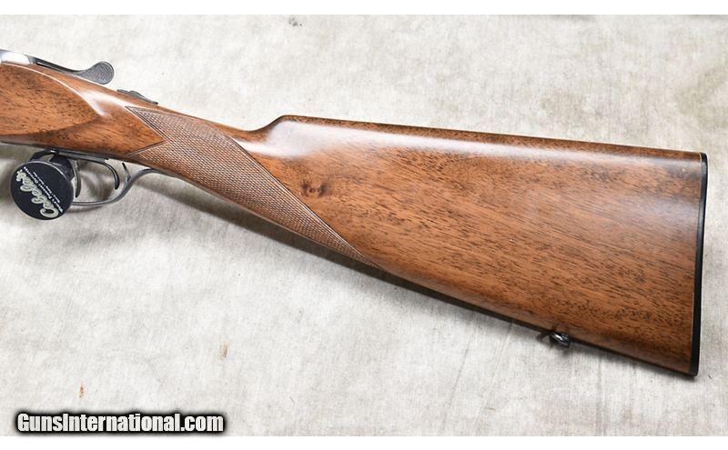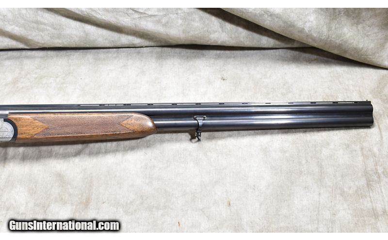 Description: Nice little over and under with the distinction of double triggers. It has a Continental straight grip stock and sharp checkering. The coined receiver is engraved with upland game scenes. It doesn't appear to have had much use and could pass for new. 16 Gauge SOLD Chambers: 2 Metal Condition: Excellent. Wood Condition: Excellent. Bore Condition: Shiny and bright. Barrels: 25-3/4 inch Triggers: Factory double triggers. Stock Dimensions: 14-3/4 inch LOP. Fore End: Matching walnut. Butt Pad: Black synthetic plate. Weight: 6 lb - 7 oz Sights: Ventilated rib with brass bead. Chokes: Fixed Full and Improved Cylinder. Item Location: Rogers |