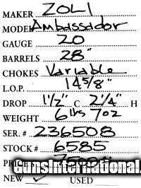 Description: Zoli Ambassador 20 gauge SOLD Serial Number: 236508 Barrels: 28 Stock Comb: 1 1/2 Stock Heel: 2 1/4 LOP: 14 5/8 Weight: 6lbs 7oz Chokes: Variable |
