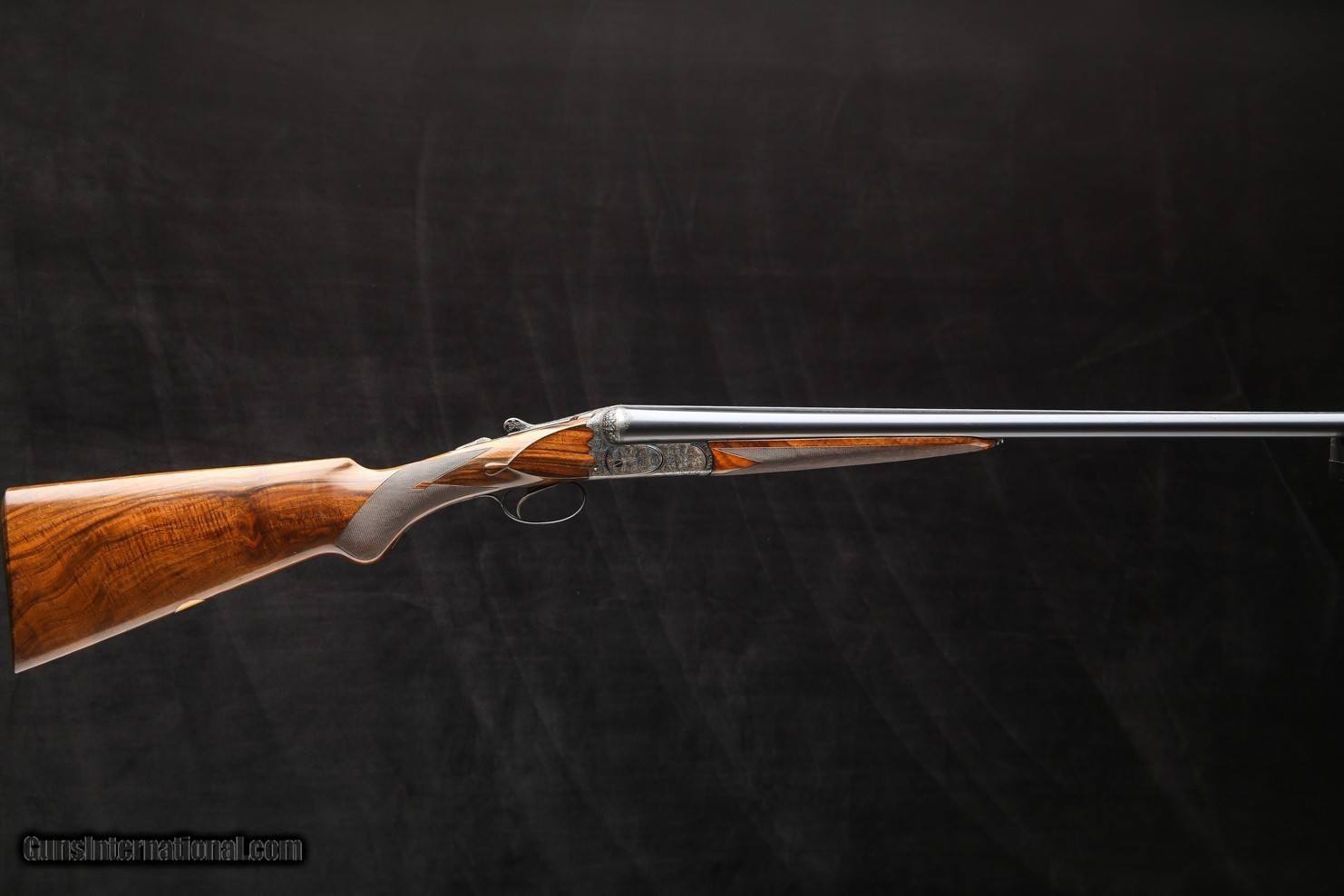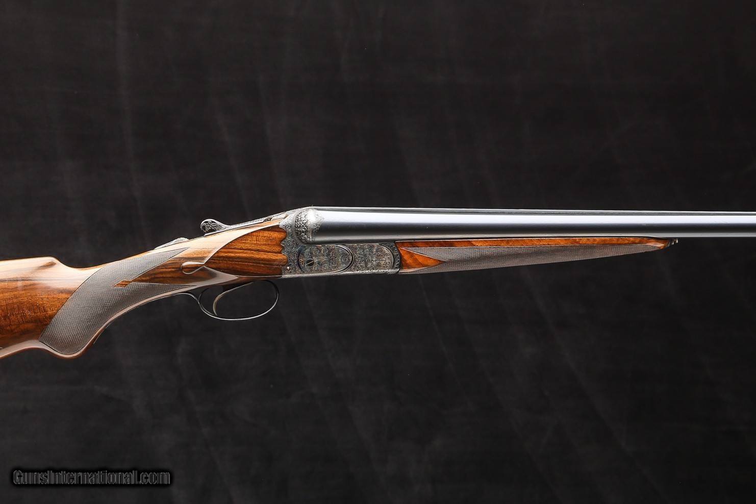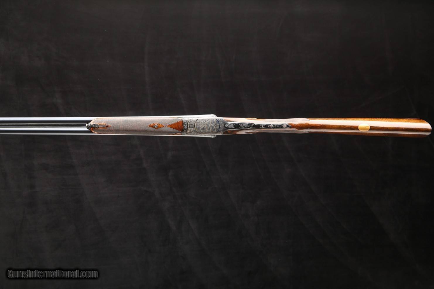Description: Zoli & F.lli Rizzini 20g Boxlock Ejector made for Abercrombie & Fitch. Based on an A&D type boxlock action with a scroll or “scalloped” back, raised side panels, a single non-selective trigger, gold lined cocking indicators, and an automatic safety. The action body is scaled to an appropriate size for a 20 bore and has full coverage acanthus scroll engraving, carved fences in an oak leaf pattern, and a pierced top lever with small wedges engraved over the breeches of the barrels. The action body is color hardened. The 26” shoe-lump barrels have original 3” (76mm) chambers, a raised flat hand-filed rib w/ a single brass bead and are marked “Abercrombie & Fitch” on top of the left side barrel. The barrels are choked: .008” in the right barrel and .018” in the lefty barrel and marked “****” and “***” respectively. The barrel flats have a “XX7” date code ca. 1971 and is marked “Zoli and Flli. Rizzini” along with the A&F logo import mark. The gun is stocked in a nicely figured piece of walnut with a contrasting horizontal figure, traditional drop points, a 14 ½” LOP over a checkered butt with a semi-pistol grip and a splinter forend with an Anson push rod release. Forend is fitted with automatic ejectors. The grip and forend are checkered in a super fine 32 LPI pattern typical of Italian made guns. The original stock oval remains blank. The wood Has some handling marks and most likely has been shot. The barrels are in good condition and the action is tight. The gun shows signs of being hunted with various scratches and marks on both sides of the oil finished stock, but there are no cracks or signs of repair. The metal shows a few marks on the barrels, but are in nicer condition than the stock, probably 97% original blue and almost all the original color hardening remains. The barrels are tight on face with perfect bores and no dents or bulges. The ejectors are timed well and strong. Made for one of America’s most iconic outdoor companies by some of Italy’s finest makers of the time. Overall, this gun is in great shape and represents a very good value in today’s side-by-side market. Price: $8,000.00 Contact Seller |