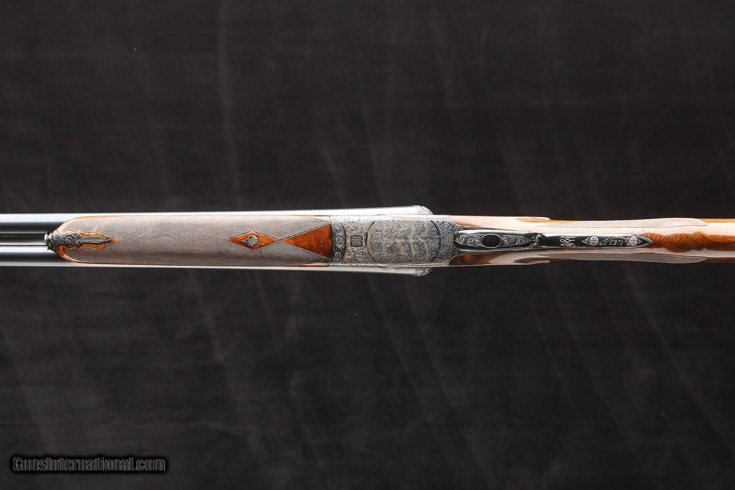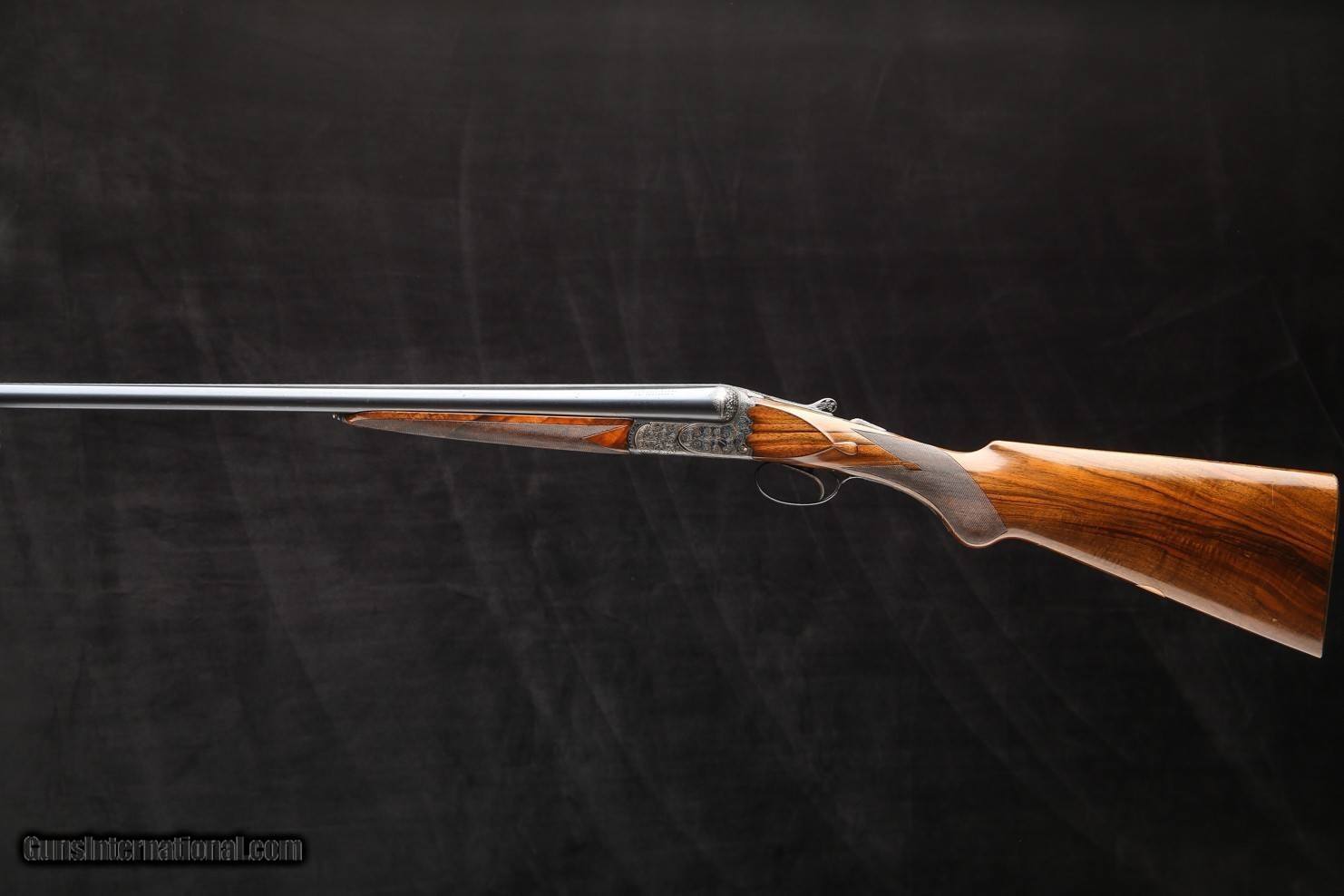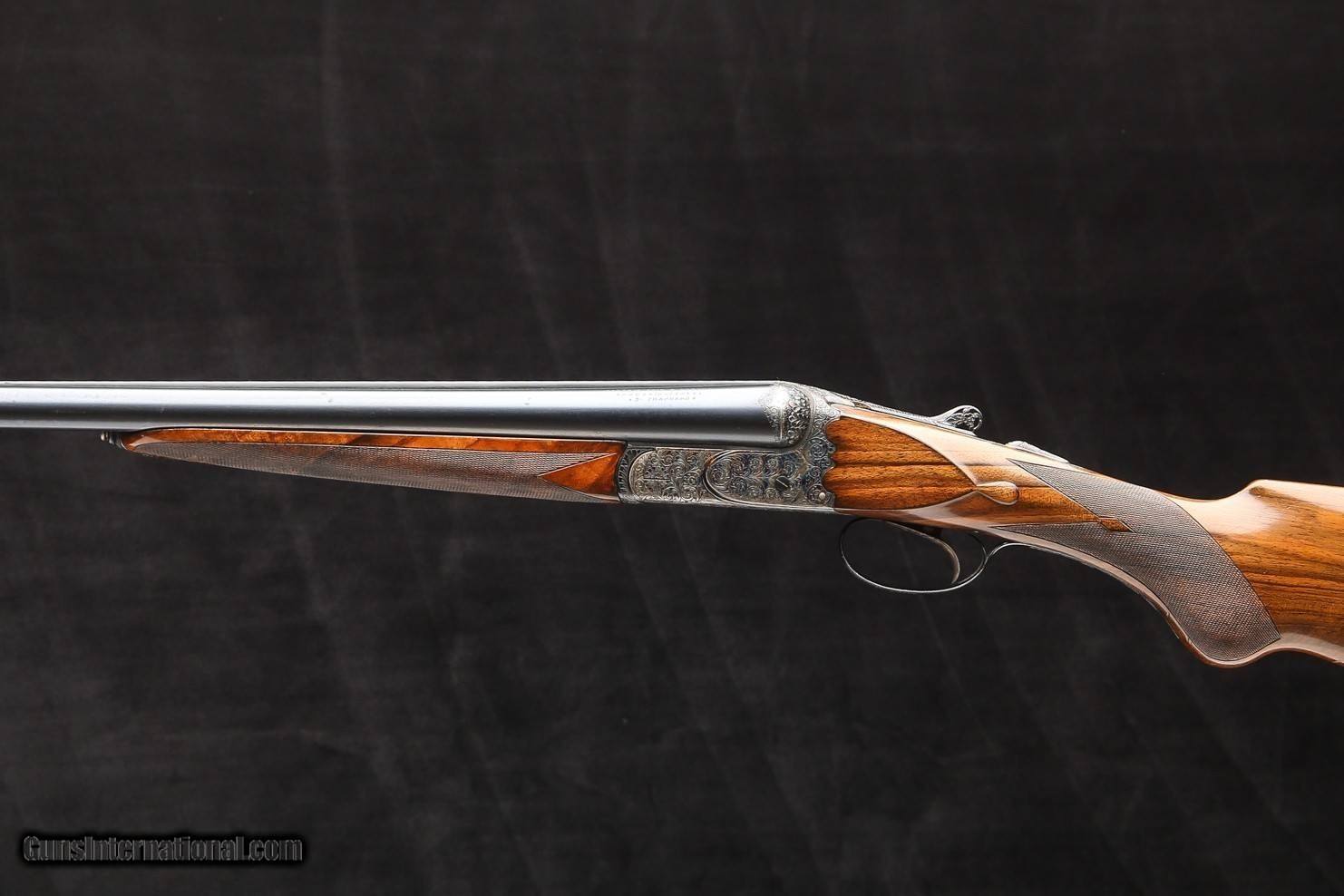 Description: Zoli & F.lli Rizzini 20g Boxlock Ejector made for Abercrombie & Fitch. Based on an A&D type boxlock action with a scroll or “scalloped” back, raised side panels, a single non-selective trigger, gold lined cocking indicators, and an automatic safety. The action body is scaled to an appropriate size for a 20 bore and has full coverage acanthus scroll engraving, carved fences in an oak leaf pattern, and a pierced top lever with small wedges engraved over the breeches of the barrels. The action body is color hardened. The 26” shoe-lump barrels have original 3” (76mm) chambers, a raised flat hand-filed rib w/ a single brass bead and are marked “Abercrombie & Fitch” on top of the left side barrel. The barrels are choked: .008” in the right barrel and .018” in the lefty barrel and marked “****” and “***” respectively. The barrel flats have a “XX7” date code ca. 1971 and is marked “Zoli and Flli. Rizzini” along with the A&F logo import mark. The gun is stocked in a nicely figured piece of walnut with a contrasting horizontal figure, traditional drop points, a 14 ½” LOP over a checkered butt with a semi-pistol grip and a splinter forend with an Anson push rod release. Forend is fitted with automatic ejectors. The grip and forend are checkered in a super fine 32 LPI pattern typical of Italian made guns. The original stock oval remains blank. The wood Has some handling marks and most likely has been shot. The barrels are in good condition and the action is tight. The gun shows signs of being hunted with various scratches and marks on both sides of the oil finished stock, but there are no cracks or signs of repair. The metal shows a few marks on the barrels, but are in nicer condition than the stock, probably 97% original blue and almost all the original color hardening remains. The barrels are tight on face with perfect bores and no dents or bulges. The ejectors are timed well and strong. Made for one of America’s most iconic outdoor companies by some of Italy’s finest makers of the time. Overall, this gun is in great shape and represents a very good value in today’s side-by-side market. Price: $8,000.00 Contact Seller |