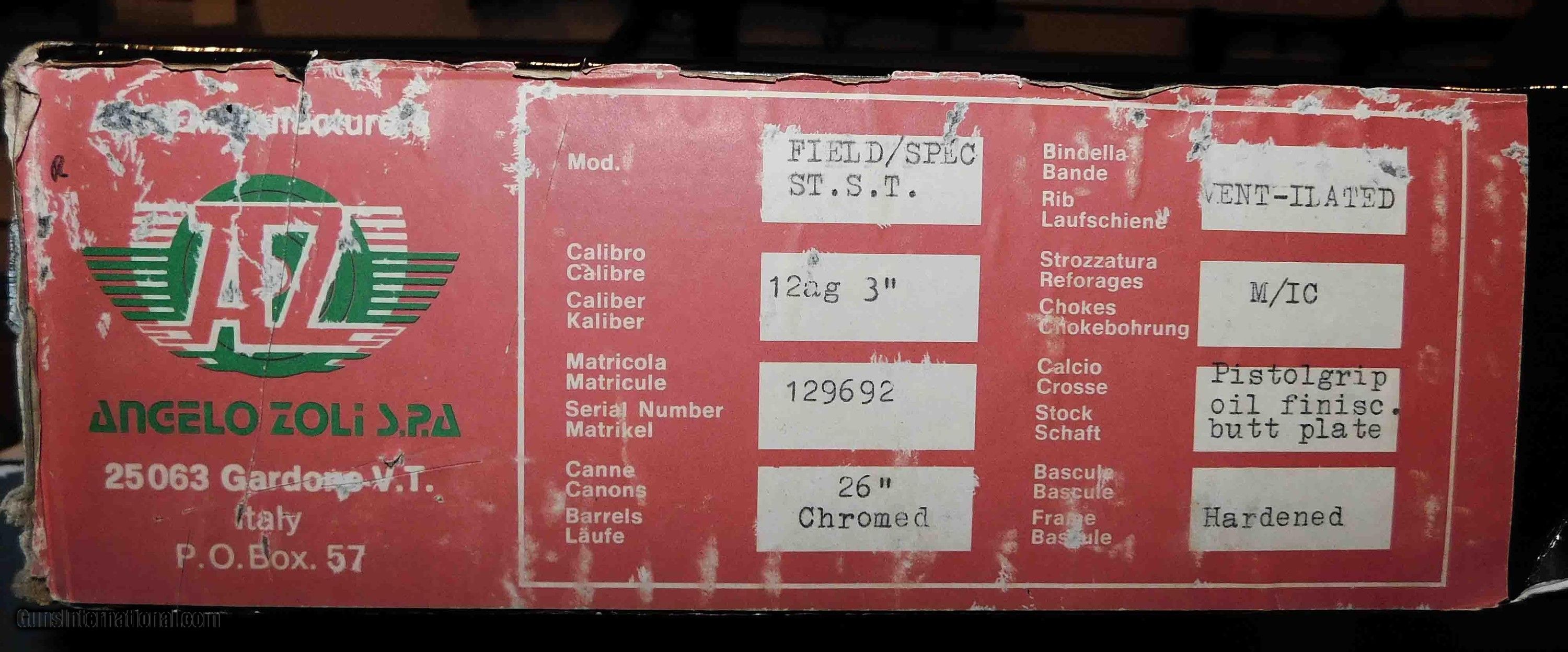 Description: ZOLI FIELD SPECIAL IN 12 GA. CAL., WITH 26" BARREL. COLOR SILVER. CONDITION 98% LIKE NEW UNFIRED. SERIAL NUMBER 129692. ZOLI MODEL FIELD SPECIAL IN 12 GAUGE CALIBER, SINGLE BEAD VENT RIB BARREL WITH FIXED MODIFIED AND IMPROVED CHOKES, 3" CHAMBER, COMES WITH BOX AND PAPERS, 98% LIKE NEW UNFIRED OVERALL CONDITION, OUR STOCK # D3261 SOLD |